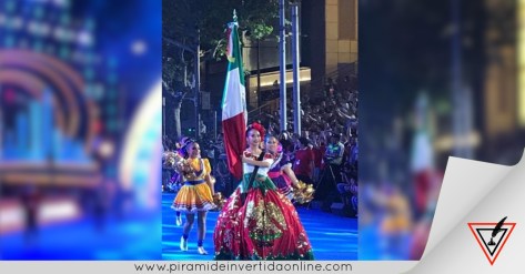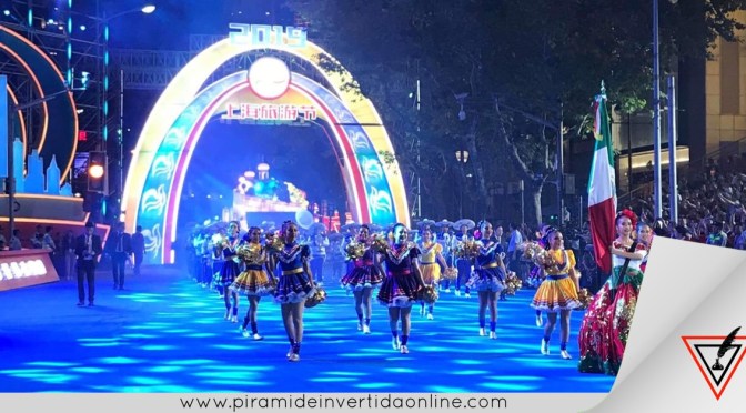 Al frente de la banda y portando un vestido estampado y bordado en lentejuela el águila representativa del escudo nacional la alumna Marlene Pérez Martinez, asombrando con porte a los espectadores asiáticos.