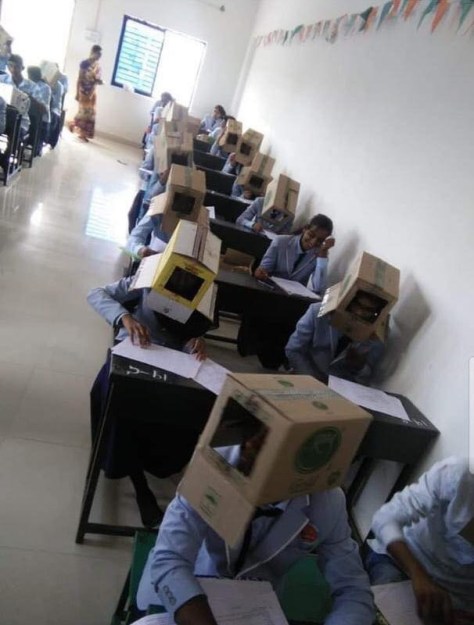 Para evitar que copiaran en un examen, alumnos de una escuela en la India fueron obligados a usar una caja de cartón en la cabeza.