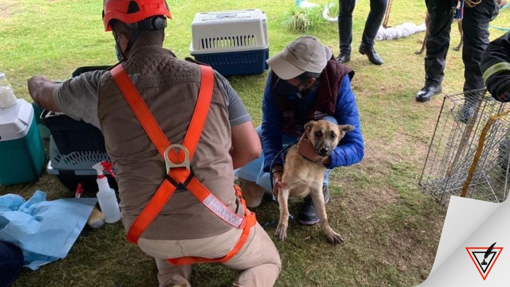 Pese a que la lluvia complicó el rescate, los brigadistas no desistieron y continuaron con los trabajos, incluso tras haber pasado más de una hora maniobrando para llegar hasta los caninos.