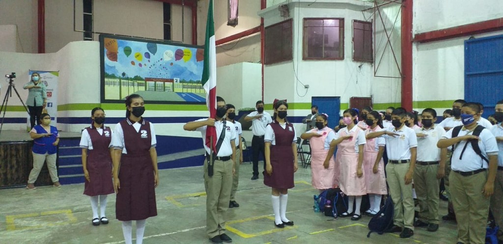 Previo a la entrega de los libros de texto gratuito y calendarios escolares, la estructura educativa que acompañó a la maestra Flores Montalvo, participaron en la ceremonia de honores que organizó la Secundaria General número 2, donde al término de los honores la titular del Crede en Matamoros inauguró oficialmente el nuevo ciclo escolar 2022-2023.