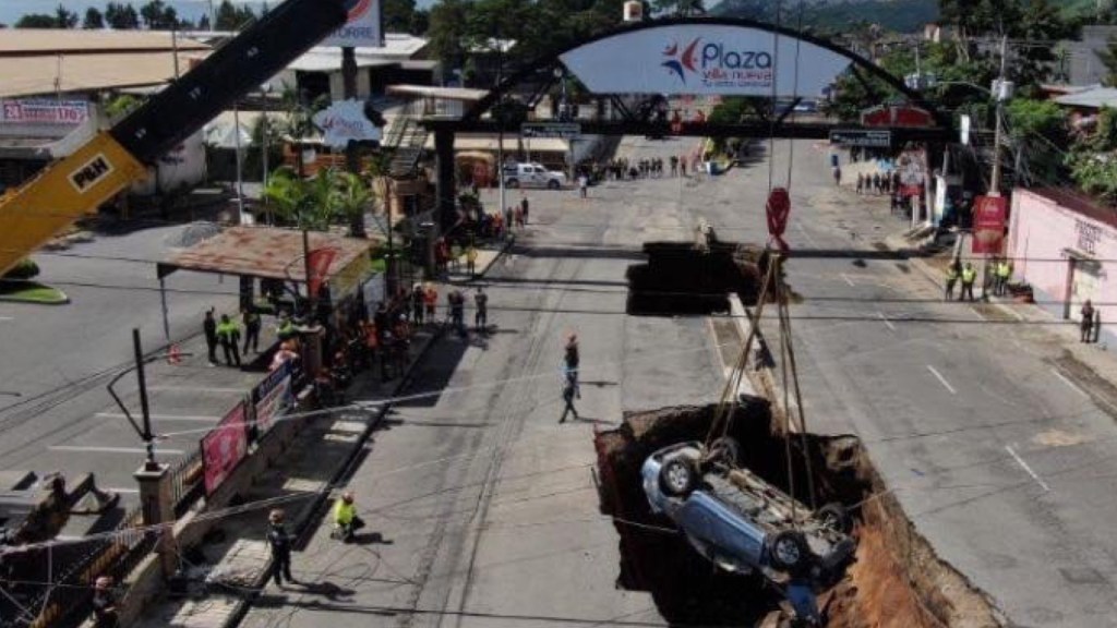 Bomberos Voluntarios confirmaron que desde las seis de la mañana realizan labores de rescate en la zona luego que la noche del sábado vecinos alertaron que se habían formado dos hoyos de gran magnitud en una calle a menos de 500 metros de otro hundimientos que quebró la carretera principal de Guatemala y que conduce al sur del país hace un par de meses.