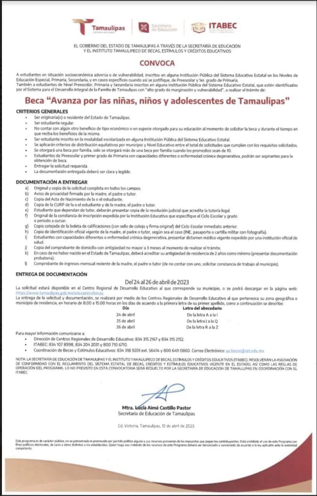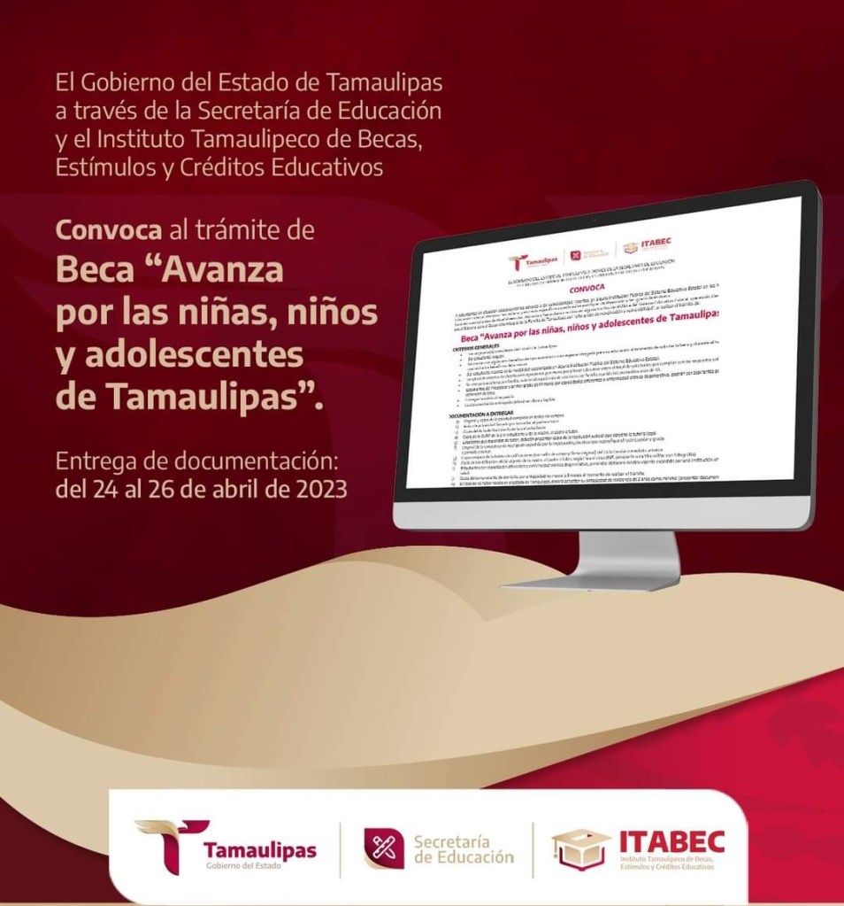 La beca «Avanza por las Niñas, Niños y Adolescentes de Tamaulipas», es una beca que otorgará el Gobierno del Estado mediante la Secretaría de Educación en Tamaulipas (SET) para alumnos tamaulipecos en situación económica adversa o de vulnerabilidad, estímulo económico que seguramente motivará a los alumnos continuar con sus estudios, concluyó.