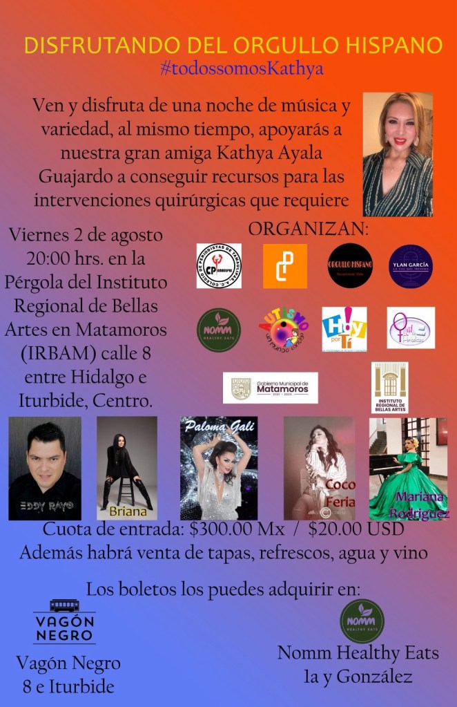 H.Matamoros, Tams.- los colaboradores de la página de premios internacionales “Orgullo Hispano”, junto con la Secretaría de Educación, Cultura y Deporte, organizarán un evento benéfico titulado “Disfrutando del Orgullo Hispano: Todos Somos Kathya”.