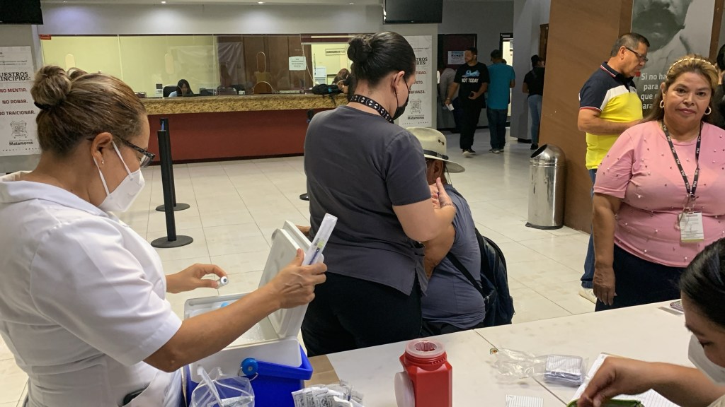 H.Matamoros, Tams.- La secretaria de salud municipal instaló un puesto de vacunación en el lobby de la presidencia municipal de Matamoros, con el objetivo de ofrecer diversas vacunas tanto a los empleados como al público en general.