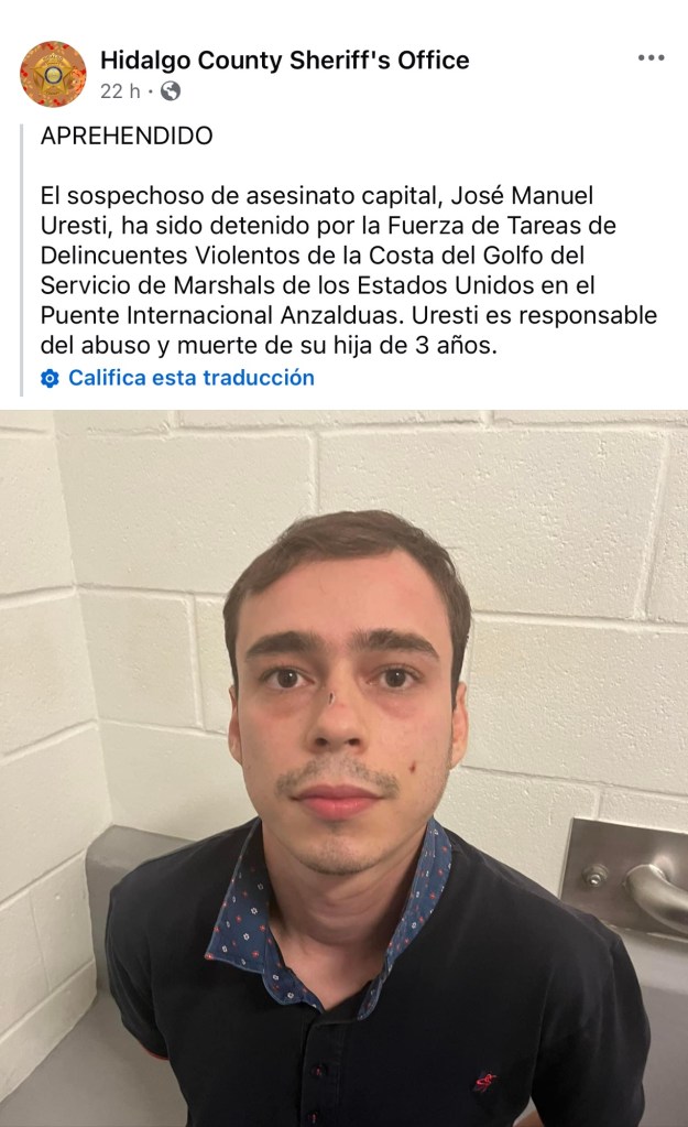 Durante el fin de semana, el sheriff del condado de Hidalgo anunció la captura de José Manuel Uresti, el hombre considerado como el principal sospechoso del abuso y muerte de su hija de tres años. La detención se llevó a cabo en el puente internacional Anzaldúas por la Fuerza de Tareas de Delincuentes Violentos de la Costa del Golfo del Servicio de Marshals de los Estados Unidos.