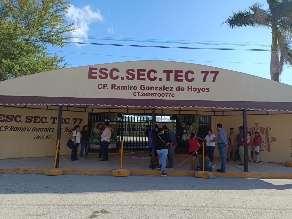 H.Matamoros,Tam.- Luego del zafarrancho que se registró la tarde del lunes 10 de febrero en la Secundaria Técnica número 77 en Matamoros, el jefe del departamento de secundarias técnicas en Tamaulipas, maestro Everardo Rodríguez Barrera, acompañado de autoridades del departamento jurídico tanto de la SET como del SNTE en el Estado, la mañana de éste día se presentaron a las instalaciones de dicho plantel.