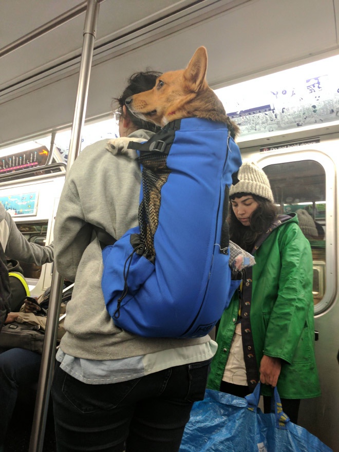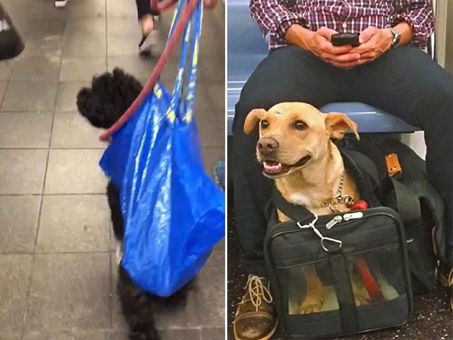 Los perros son prohibidos en el metro de Nueva York a menos que quepan en una bolsa, los dueños de perros no decepcionaron.